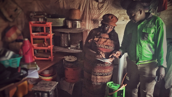 A SmartGas delivery technician visits a customer’s home in Nairobi, Kenya, to exchange her propane cylinder, show her how to add credit using her mobile phone, and walk her through a safety check. (Photo by Jessica Alderman)