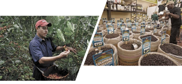 The owner of a small farm near Matalgapa, Nicaragua, picks coffee (left). A coffee buyer makes a selection at a grocery store on the Upper East Side of New York City (right). (Photo by Jane Jarman/Corbis, left, and Richard Levine/Alamy, right)