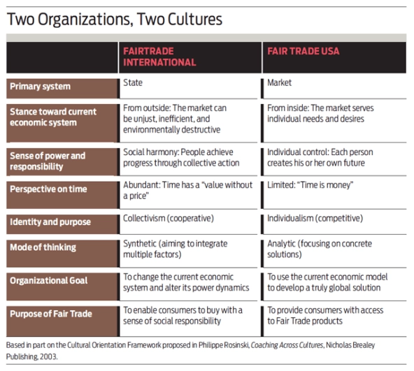 Let’s take a step back and look at the underlying reasons for the split between Fairtrade and Fair Trade USA. In particular, let’s use a variation of the cultural orientation analysis that I discussed earlier. By working to understand the cultural dynamics that have resulted in a conflict between two visions of the fair trade movement, we will be able to imagine options for the movement that take us beyond a purely competitive stance.