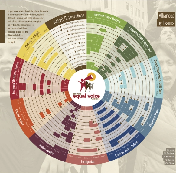 This Bay Area Equal Voice Network Alliance Map illustrates Marguerite Casey Foundation’s grantmaking model, which provides long-term, general-operating, multi-year grants to organizations to build broader alliances for systemic change at all levels: locally, regionally, statewide, and nationally. It also represents the areas where organizations are partnering to build scale and capacity.