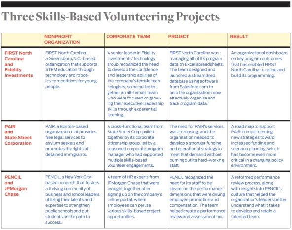 For the companies that engage in SBV, there is also significant skill development for the employees who participate, particularly if that skill development is integrated as a goal of the engagement early on. Fidelity and John Hancock, for example, have established their SBV programs as experiential talent development from their inception. These programs are targeted, branded, and implemented separately from the company’s other volunteer programs.