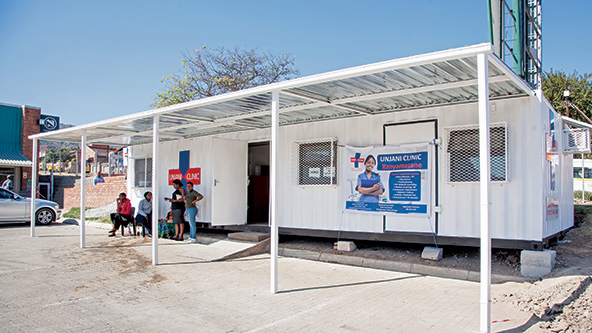 Unjani Clinics uses specially outfitted shipping containers to provide health care. (Photo courtesy of Unjani Clinic)