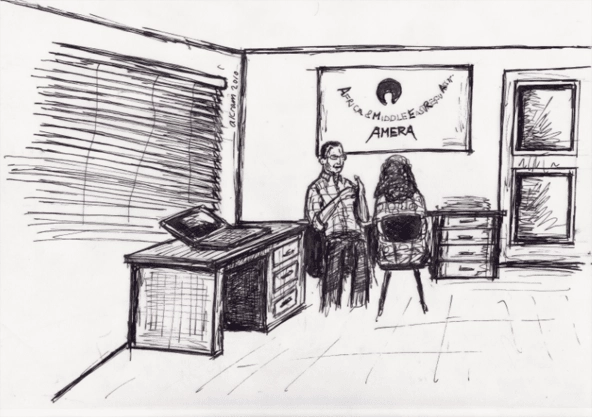 AMERA’s refugee clients engaged in one-on-one sessions with legal advisors and psychosocial workers. (Illustration by Akram Abdo)