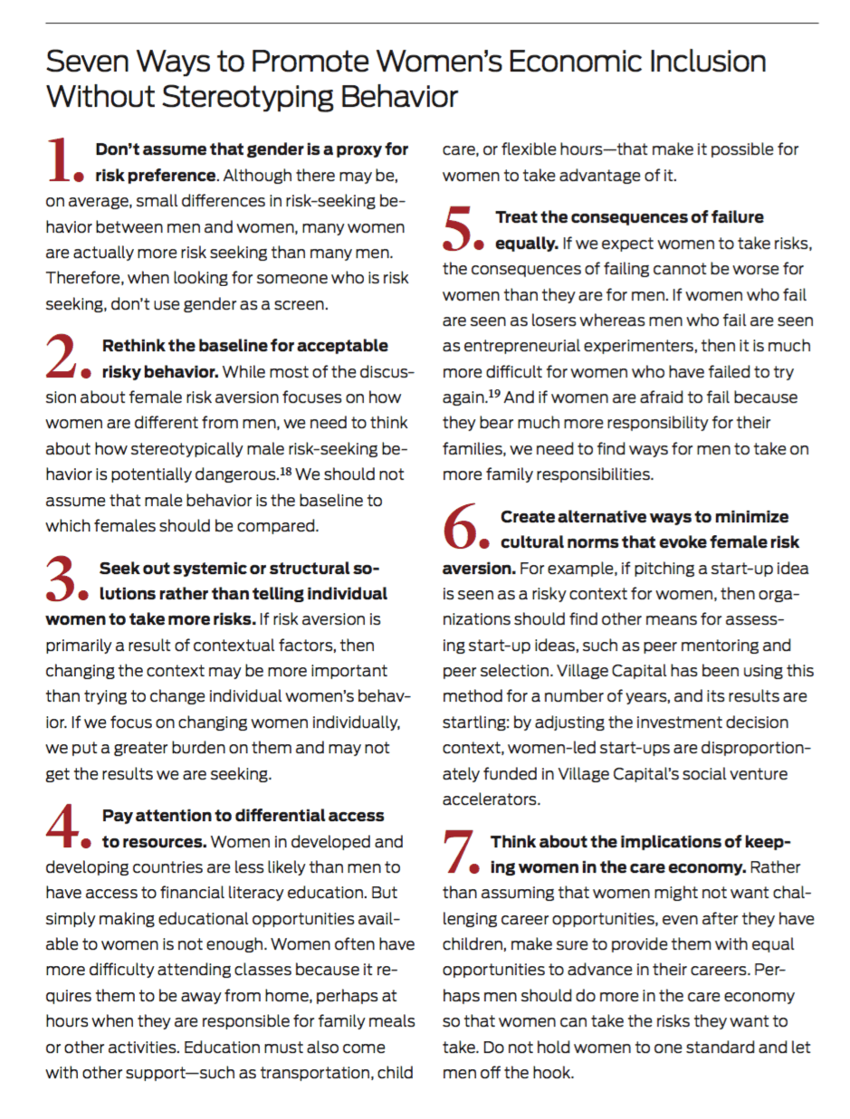 With the accelerating interest in women’s economic and financial inclusion in both developing and developed economies, we must take care in how the case for action is crafted by organizations that want to help. Relying on the rhetoric of female risk aversion as either a justification for action or an explanation for the gaps in opportunities may paradoxically hinder progress. Understanding the underlying social and structural sources of the apparently risk-averse behavior of women and risk-seeking behavior of men may help organizations take more productive actions to make change.