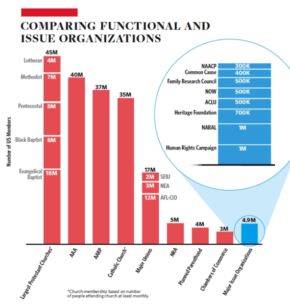 But most Americans don’t view themselves primarily as activists. As a result, issue organizations rarely grow to engage more than a few hundred thousand members. They struggle to build independent donor and revenue bases, instead becoming highly dependent on foundations and large donors. The top five issue groups combined have fewer members than the NRA alone. They are an even smaller fraction of the membership of AARP or the largest churches. (See “Comparing Functional and Issue Organizations,” below.)