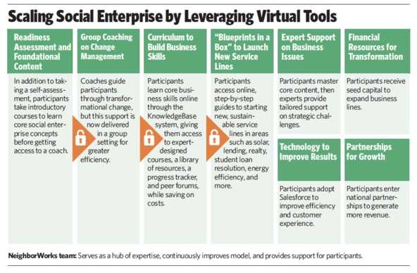 Recognizing the urgent need among network members for more sustainable funding, NeighborWorks America established a pilot program to create a strong, replicable, effective social enterprise model along with the tools and strategies to support it. The model has five core components: change management, efficient and responsive business operations, smart branding and technology, data-driven decision making, and peer support.