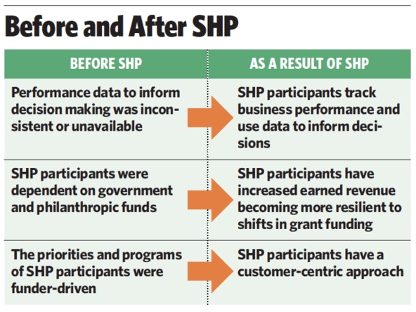 Nonprofits that go through SHP also take a hard look at their business operations with an eye toward tweaking them, adding to them, or completely reimagining them. These changes can help both the nonprofit and its customers become more financially sustainable.