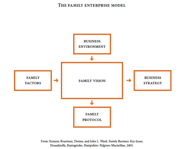 In this model, it's clear that the family's vision is the central force, and two of the four important factors surrounding the vision relate to the family. Interestingly, this theory of a family enterprise separates official family protocol, or governance, from less-formal family factors, including personal dynamics and family members' financial status. In many family enterprises, the need for liquid assets by one or more family members can dictate the fate of a company, as can the absence of an agreed-on successor.