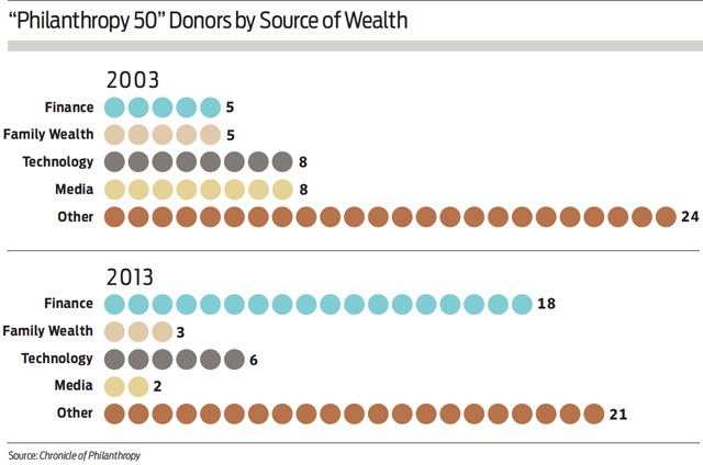 Moreover, a disproportionate number of the largest charitable gifts in recent years have come from people in the finance profession, a point almost certainly understood and internalized by sophisticated organizations with ambitious fundraising goals. Between 2003 and 2013, the percentage of the 50 largest US donors whose source of wealth was finance soared from 10 percent to 36 percent. (See “‘Philanthropy 50’ Donors by Source of Wealth” below.)