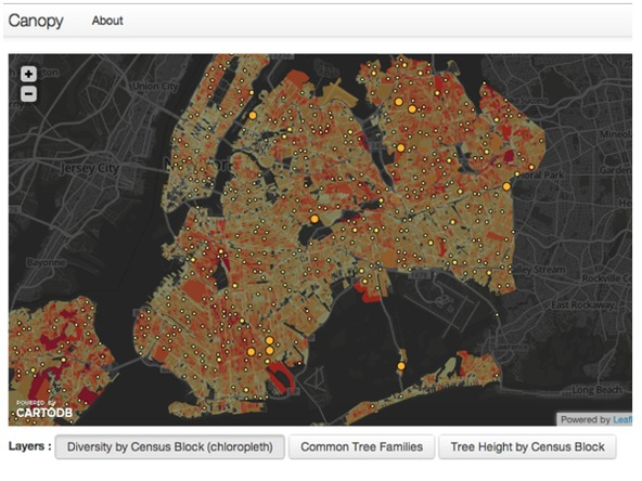 Visualization of NYC Parks’ Department data showing tree density in New York City.