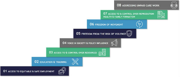 The ICRW report mentioned above described eight building blocks for sustainable women’s economic empowerment. We have adapted these as follows: