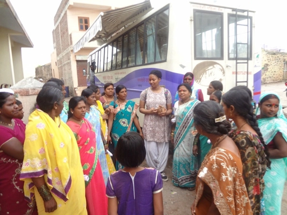 A Georgetown University Impacts fellow working with Mann Deshi Foundation in Mhaswhad, India, meets with women entrepreneurs.