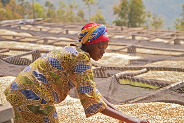 A woman at the Dukundekawa cooperative in Musasa, Rwanda, prepares coffee beans for drying. (Photograph by Grazioso Pictures, Inc., Courtesy of Root Capital)