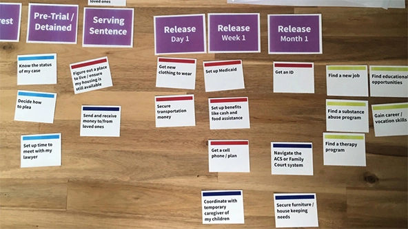 Using tools like Lego Serious Play, Appreciative Inquiry, collaborative journey mapping, and rapid prototyping, we asked women to imagine better alternatives to what they experienced. Together, we developed a series of concepts focused on moving reentry planning earlier in the jail experience, and streamlining how women request and get matched to reentry providers.