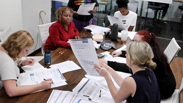 Women affected by the criminal justice system give feedback on paper prototypes of an intake screening. (Photo by Shannon Straney)