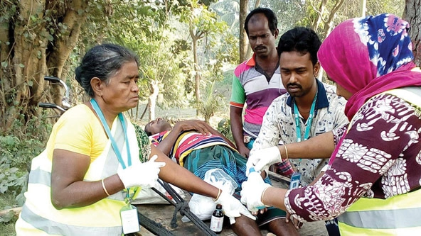 TraumaLink volunteers treat a man injured in a road traffic accident in Manikganj, Bangladesh. (Photo courtesy of TraumaLink)