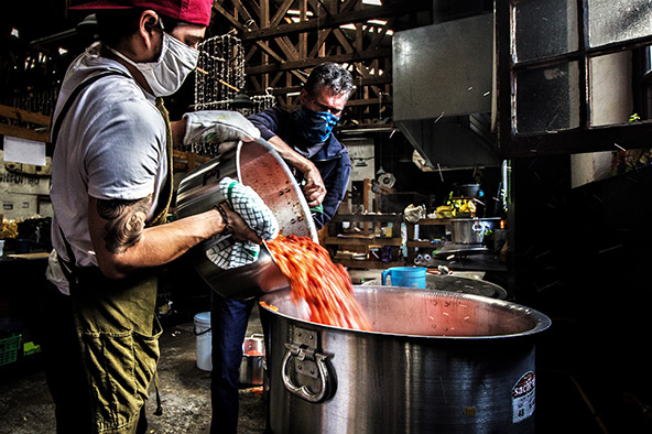 Muizenberg CAN volunteers work in the Muizenberg community kitchen, temporarily housed at the Blue Bird Market, a local goods market. (Photo by Patrick McKenna)