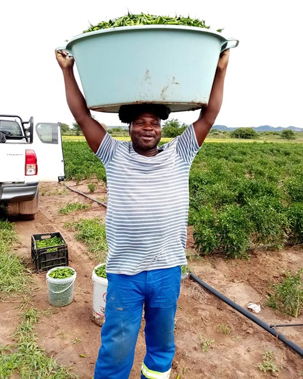 Farmer supported by FoodFlow carries a harvest of beans in Limpopo. (Photo by Thanyani Ramarumo)