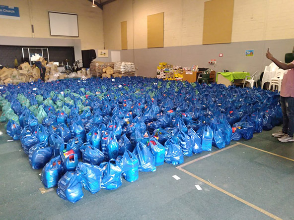 Food parcels being packed in a repurposed church hall by Boost Africa. (Photo by Christine Fyvie)
