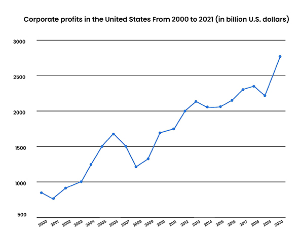 In 2021, US companies generated $2.77 trillion in profits—the largest ever recorded in history. This is a significant increase since 2000 when corporate profits totaled $786 billion. Social progress, on the other hand, shows a very different picture. From 2000 to 2021, progress on the United Nations Sustainable Development Goals has been anemic, registering less than 10 percent growth over 20 years.