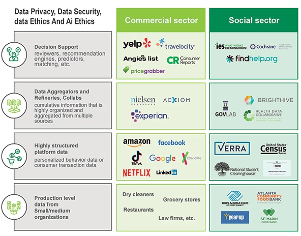 Before going any further, we do want to caution that the commercial data ecosystem, left unregulated, has led to negative consequences, especially for marginalized groups. Access to vast amounts of private, personalized information demands careful regulation and control. Data ethics has even more heightened sensitivity in the public and nonprofit sectors, where trust is essential to an organization’s license to operate. Despite the ethical pitfalls of the commercial sector, there are still important mechanisms of the data ecosystem that are worth leveraging to drive positive social and environmental outcomes.