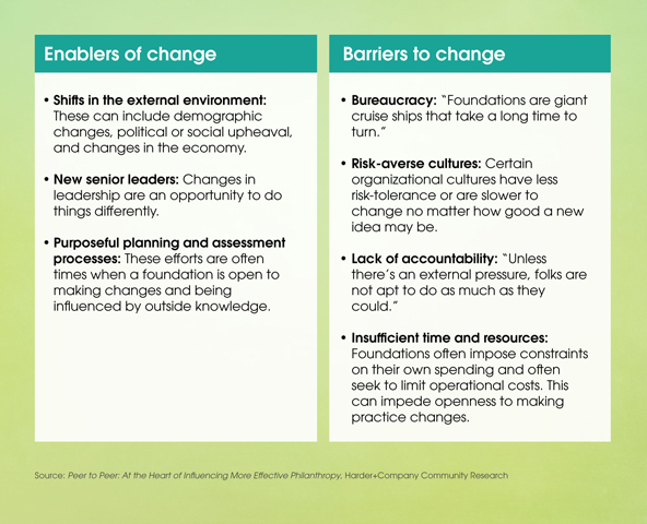 Here are some of the enablers of and barriers to foundation practice change we identified: