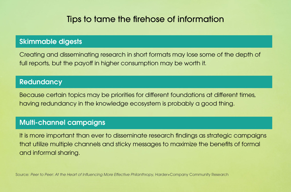 One challenge facing knowledge producers is that foundation staff feel overwhelmed by the volume of information coming at them, regardless of whether or not they “opted-in” to receive it. Similarly, foundation boards say they face their own firehose of information and generally look to staff to curate knowledge about philanthropic practice; it rarely reaches them directly.