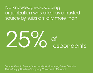 In the absence of prior benchmarks, it’s hard to know what this finding really means. On the one hand, trust toward knowledge producers could be (and we think should be) higher than it is. On the other, it’s possible that a 25 percent market share of trust is, in fact, high for the philanthropic sector. Perhaps we funders are a wary audience, not quick to trust in general. Or perhaps the nature of the power dynamics at work—where funders are used to being pitched and persuaded—puts them more “on guard.” The fact that many knowledge creation and dissemination organizations in the sector are also either fundraising or operating fee-for-service offerings might also affect trust levels.