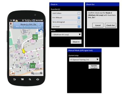 Once the routes are in place, GPS tracks the location of each walking group; each escort leader carries a GPS-enabled smartphone. With data transfer rates of only 2-3 Kenyan Shillings (2-3 US cents) per megabyte, we envisioned this as a cheap and nonintrusive method for walking groups to communicate their location information to potential users.