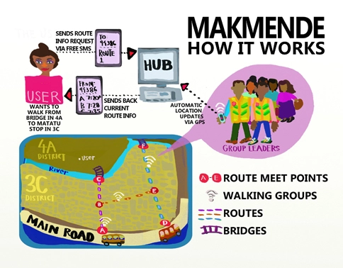 Makmende was conceived as a safe commute system for Mathare residents—a system of citizen-led escort teams that travel commonly used routes within Mathare. Each walking group traverses the route according to a rough schedule, making short stops at frequented areas such as Matatu bus stands, markets, and communal latrines. The escort teams use smartphone technology to keep track of their location and to coordinate with local residents who want to join the walking group.