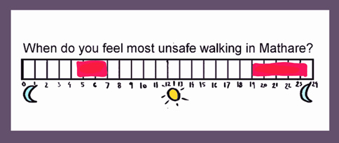We determined that the routes may run for only a few hours a day, and planned to conduct surveys and interviews to identify the most used routes. We also wanted to determine the routes with an eye toward avoiding danger zones. In our preliminary research, Mathare residents felt most unsafe during dusk and dawn hours, so we expected that these might be appropriate operating hours.