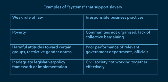 Examples of “systems” that support slavery. (Image by the Freedom Fund)