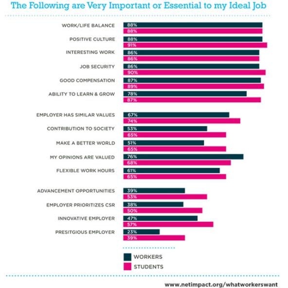 The executive summary of “Net Impact’s Talent Report: What Workers Want 2012” includes some ways that employers can integrate impact opportunities into the workplace. Of course, it’s not always easy. But a more satisfied workforce—which translates to a more engaged and productive workforce—makes it well worth it.