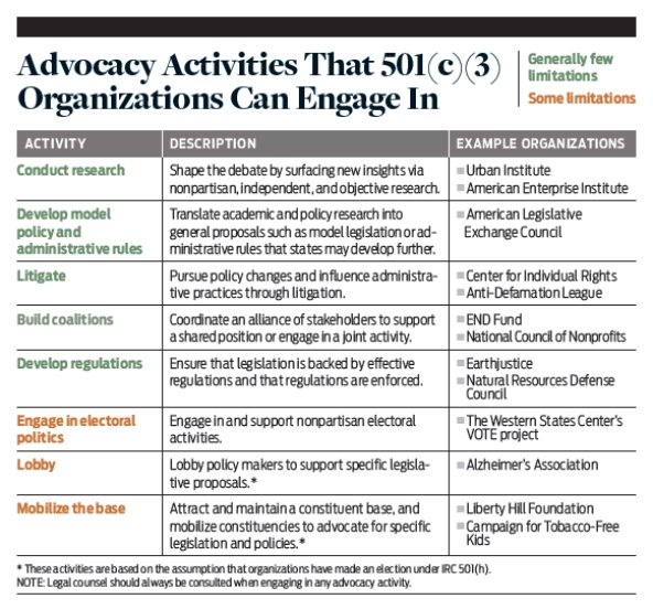 The US Internal Revenue Code gives institutional philanthropy significant latitude to have a point of view on policy outcomes. Federal law allows nonprofit organizations to participate in a mix of direct lobbying, grassroots mobilization, policy development and implementation, voter registration and get-out-the-vote efforts, and candidate forums. Many nonprofit organizations, however, are unaware of (or fail to utilize) their legal capacity to directly interact with the leaders of federal agencies, governors, and mayors, who have the power to work on their behalf.