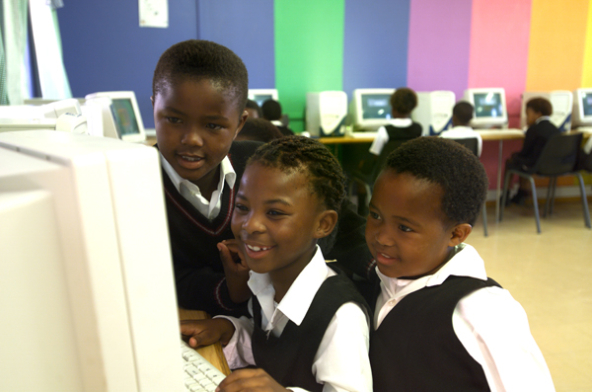 Primary school students work at a township computer center in 2003.