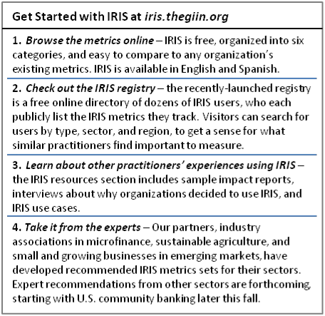 Additionally, we have posted sets of IRIS metrics recommended by field-building groups in specific impact sectors, including sustainable agriculture, microfinance, and small and growing businesses in emerging markets. IRIS metrics embedded into GIIRS are also available for download. Over the coming months, IRIS will be publishing additional metrics recommendations from industry associations, including a set for U.S. community banking.
