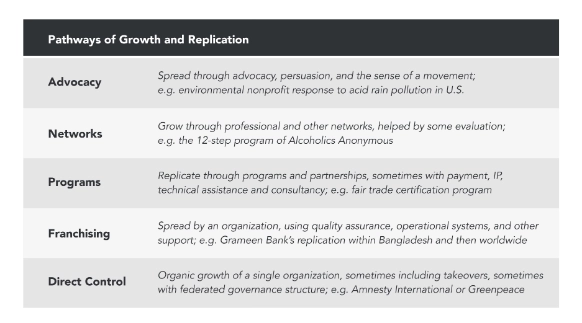 Geoffrey Mulgan has created a valuable tool for understanding the unique and varied paths that social innovations take as they scale up. He identified five pathways to scale, which we have summarized below: advocacy, networks, programs, franchising, and direct control.