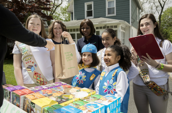 With her troop behind her and some older Girl Scouts on site to mentor and provide sales tips, a Girl Scout Daisy hands a cookie customer her purchase in White Plains, New York. Girl Scouts participating in the Girl Scout Cookie program learn valuable skills like goal setting, decision making, money management, people skills, and business ethics. (Image courtesy of Girl Scouts of the USA)