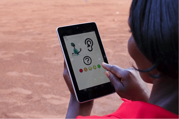 A Ugandan woman uses DevCAFE to provide feedback on effectiveness of family planning training program. (Photo by Brandie Nonnecke)