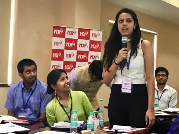 Kanika Sharma, an employee at DesiCrew, discusses her experience working for a social enterprise at a research stakeholder dialogue event at the New Delhi Institute of Management (NDIM)