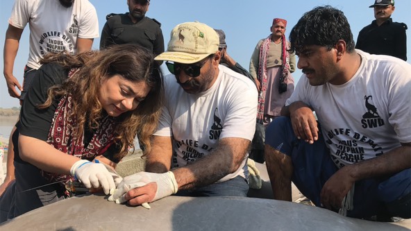 Dr. Uzma Khan (left), Asia coordinator for WWF’s River Dolphin River Initiative, tags an Indus river dolphin in Pakistan for satellite tracking. (Photo by Janan Sidhu, courtesy of WWF)