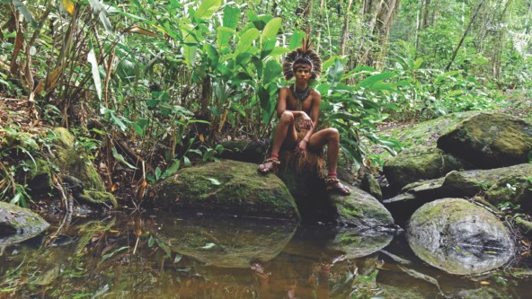 Siricuá Pataxó, an Indigenous guide from the Pé do Monte village, sits by a sacred pool in Brazil’s Monte Pascoal National and Historic Park. (Photo by Nico Ferri, courtesy of WWF)