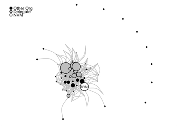 These findings indicate that NVM was punching above its weight. Using a numerical measure called an eigenvalue, which is a measure of a node’s relative influence in a network (Bonacich 2007), we found that NVM had the fifth-highest score compared to all other organizations. All four of the groups that had higher scores than NVM on this measure were national groups with state affiliates: the Sierra Club, Planned Parenthood, the League of Conservation Voters, and Virginia’s teacher’s union, a state affiliate of the National Education Association. By way of comparison, NVM was only ten years old, while the teacher’s union was founded in 1863 and represents more than 50,000 teachers throughout the Commonwealth. Three delegates reported that they only strategized with NVM and one or two other organizations listed in the survey.