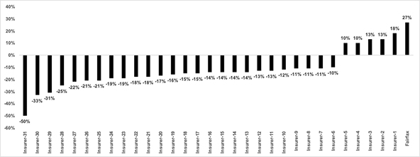 However, there have also been powerful exceptions. Consider, for example, the case of Prem Watsa who is the founder, chair and CEO of Fairfax Financial Holdings. Prior to the 2007-2008 financial crisis, Mr. Watsa purchased economically priced CDS, which reportedly generated a gain of more than $2 billion against an investment of $341 million. While the specifics of Mr. Watsa’s position are not publicly available, one can surmise that because he is a corporate manager the CDS he purchased were appropriate for the balance sheet he was managing, which is to say hedging. In general, there are three ways to manage the risk of a significant balance sheet exposure: (1) reduce it, (2) diversify away from it or (3) hedge it. Each of these alternatives can be informed by value investing in general, and by the margin of safety principle in particular. In the case of hedging, the results of Mr. Watsa’s position speaks for itself: Exhibit 2 profiles 10% or greater changes in property and casualty insurance company performance in the third quarter of 2007. The financial performance of Fairfax Financial Holdings—shown at the extreme right of the exhibit—is materially greater than the rest of the insurance industry at the time.
