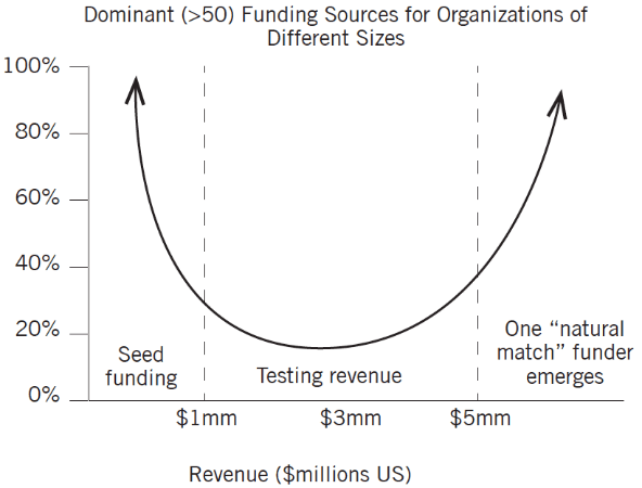 Dominant (>50%) funding sources for organizations of different sizes. Source: Adapted from William Foster, Ben Dixon, and Matthew Hochstetler, In Search of Sustainable Funding: Is Diversity of Sources Really the Answer?