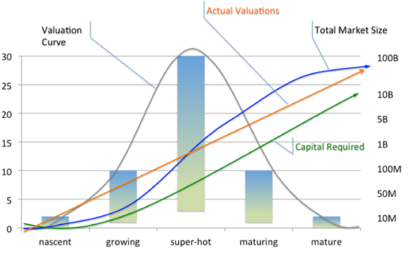 Looking at the World Wide Web, this would be when the first web browsers were being developed in Urbana Champaign in the early 1990s would be the nascent stage. Bitcoin in 2010 after it was invented by Satoshi Nakamoto but before the first major wave of hype in 2013, was a nascent market. Valuations at this stage are tough because there are very few metrics they can be based off of. The Capital Required is also relatively small, as is the market size.