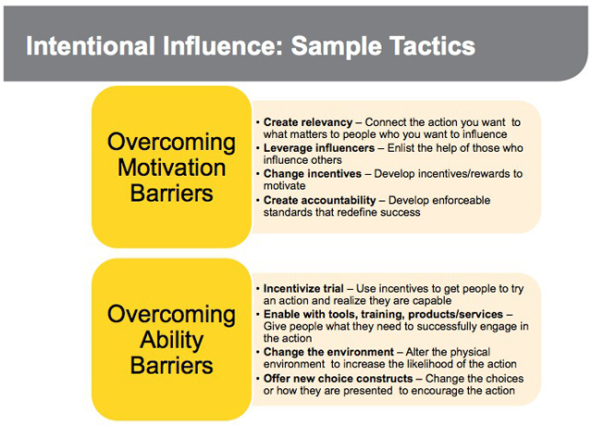 While identifying desired actions is fundamental to intentional influence, empathizing with and understanding stakeholders’ beliefs and the context in which they operate is equally—if not more—valuable. The work of identifying and overcoming barriers begins with putting ourselves in their shoes, developing hypotheses about why they aren’t taking the action, and testing what works. The book Influencer: The Power to Change Anything asserts that for people to engage in a behavior, they have to believe that it is worth it and that they can do it. This framework provides a starting point for thinking about what the barrier to action might be—a lack of motivation or ability—and how to overcome it.