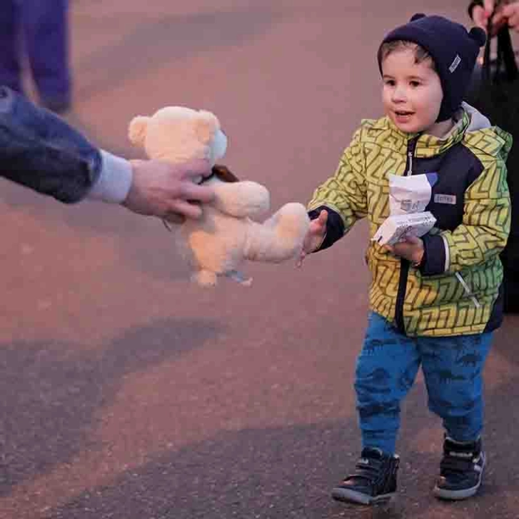 Children fleeing the Russian invasion of Ukraine are gifted a plush toy from volunteers when they arrive in Hungary.