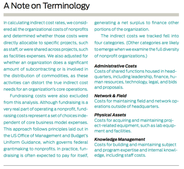 Before beginning our research into nonprofit cost structures, we had to be clear about what exactly we were looking for. We quickly set aside the term “overhead” because it lacks a standard definition. We opted instead to use “indirect costs.” That term typically includes all costs that are not directly attributable to a specific project. “Indirect cost” is more inclusive than “overhead,” which is typically understood as only administrative costs. And it has an analog in the business world, where the term “SG&A” (selling, general, and administrative expenses) covers all non-production costs, such as executive salaries, staff training, office space, equipment, research, travel, and technology—all reasonable and necessary costs of doing business. Likewise, in the nonprofit world, indirect costs are necessary and inextricably tied to a nonprofit’s ability to accomplish its goals.