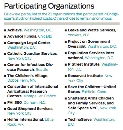 Bridgespan examined the cost structures of 20 nonprofit organizations across four different segments. At those organizations, indirect costs ranged from 21 percent to 89 percent of direct costs.